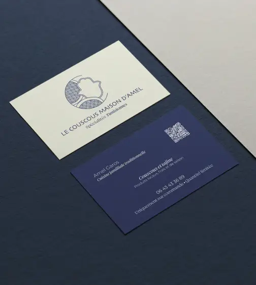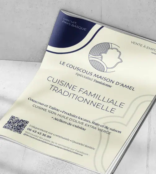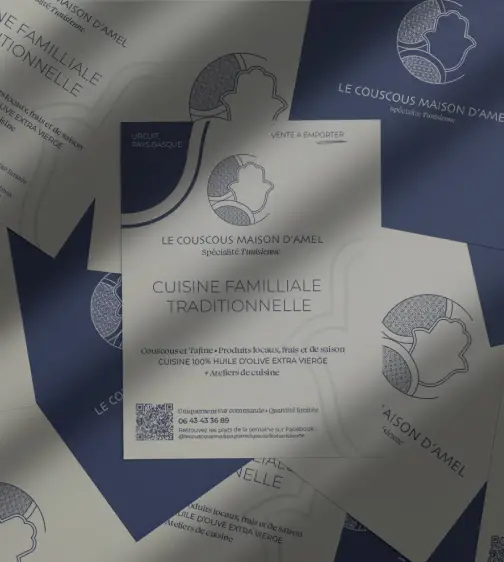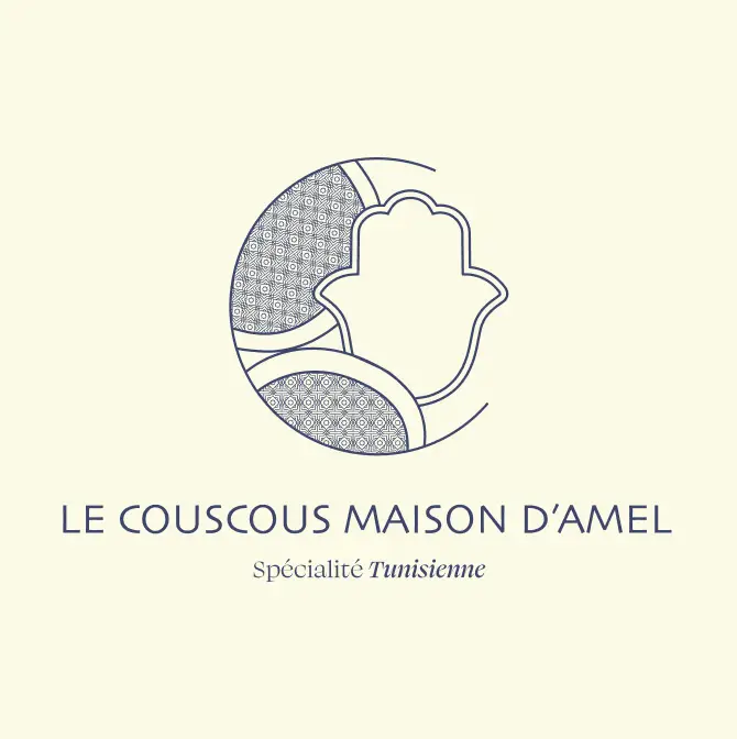 Deux typographiques se mélangent : la première pour “Le couscous maison d’Amel”, pour apporter un côté méditerranéen, oriental, et une deuxième plus fine et classe, pour apporter du savoir-faire et se différencier de la cuisine de restauration rapide.